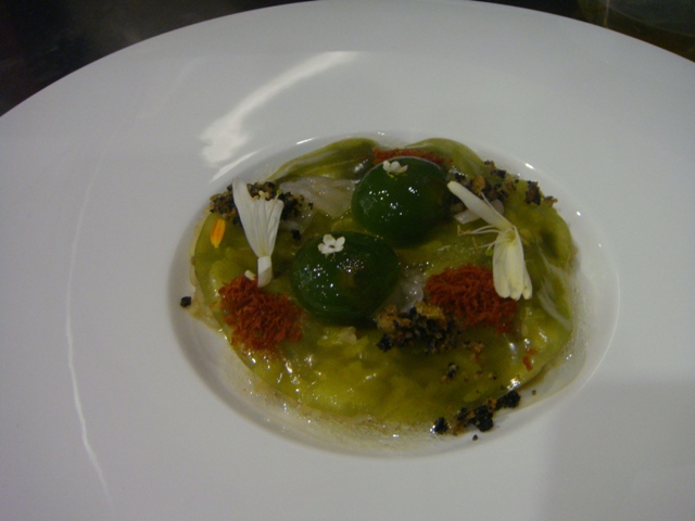 E aqui todo o esplendor da actual cozinha do Tavares. O arroz coberto por uma gelatina de agrião e em cima caracóis esferificados e flores comestíveis.